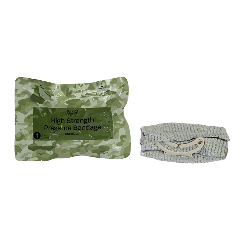 Dynarex DynaSafety High Strength Pressure Bandage are flexible dressings that feature a locking closure clip and pressure applicator to bind hemorrhaging injuries. The sturdy closure clip securely fastens the bandage around the trauma site for reliable protection during the healing process. The Pressure Bandages are crafted with non-woven materials for a strong and supportive hold. The Bandages are vacuum-packed for compact storage in first-aid and trauma kits, and features camouflage packaging for covert and tactical situations.