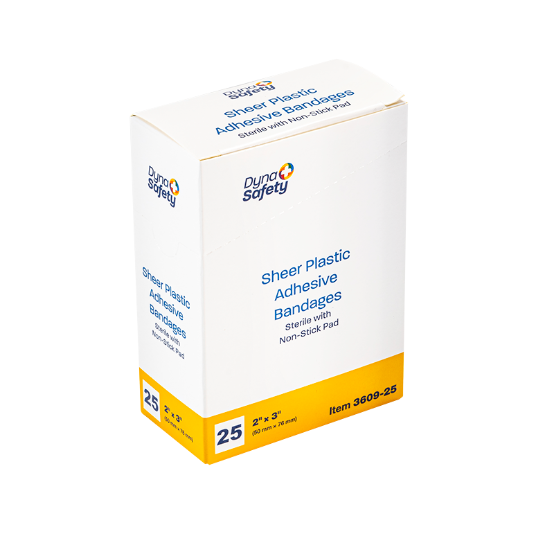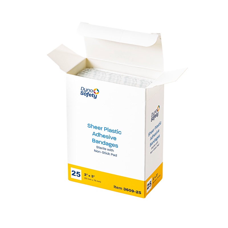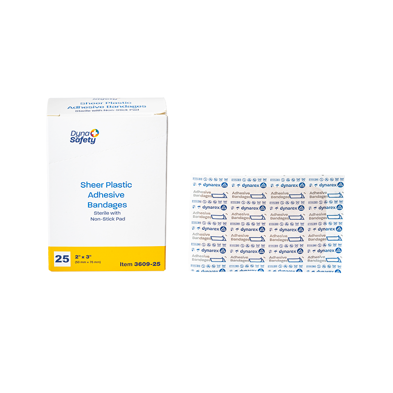 Dynarex DynaSafety Sheer Plastic Adhesive Bandages are sheer plastic bandages designed to protect minor cuts and abrasions. The Bandages are constructed with ventilated plastic to allow for improved breathability and long-lasting adhesive to help hold bandage securely in place. Each Bandage features an absorbent, non-stick pad to cushion the wound area for optimal comfort when changing dressings. These sterile Bandages are packaged in dispenser boxes for convenient handling.