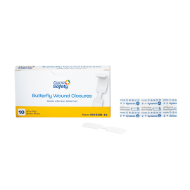 - Sterile butterfly bandages designed to protect and secure small wounds and incisions