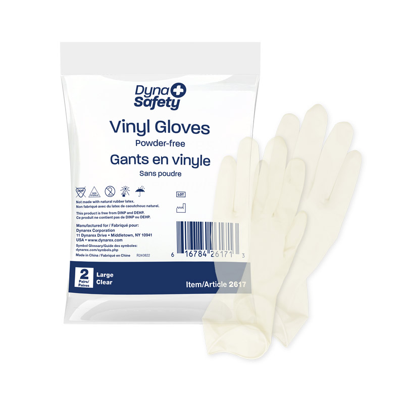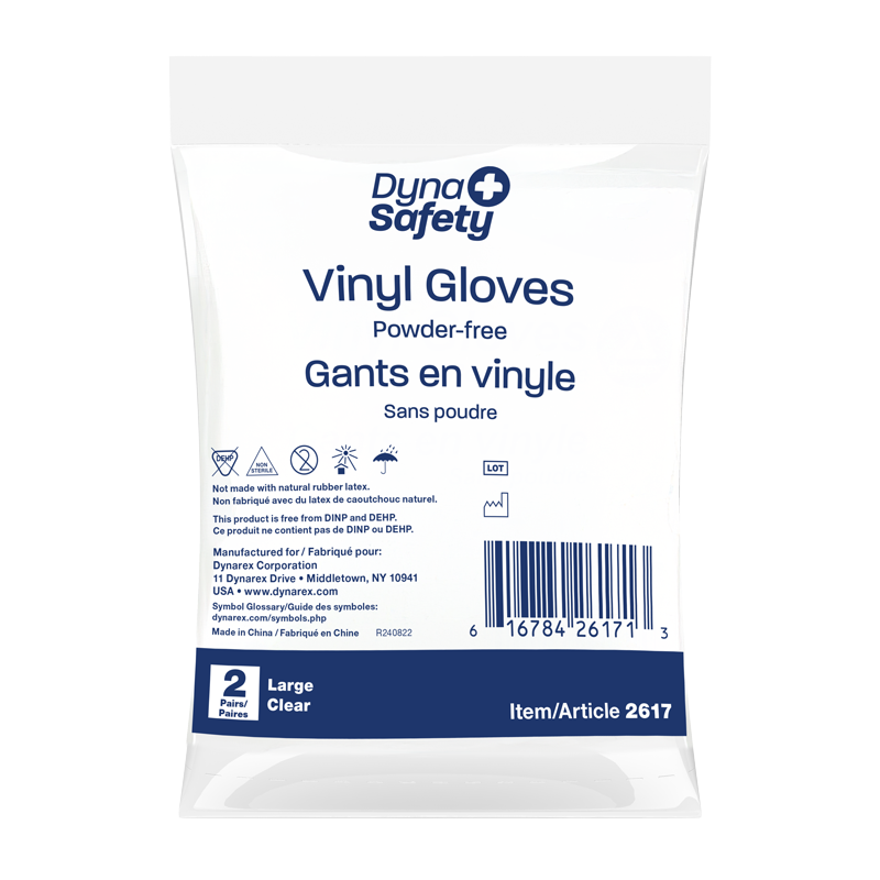 Dynarex DynaSafety Vinyl Gloves in a Bag are premium-quality, powder-free vinyl gloves designed for improved protection and flexibility. The Gloves are crafted from a soft vinyl resin for added elasticity and increased sensitivity. These ambidextrous Gloves feature a minimum thickness of 3 mils at the palm and 2 mils at the fingertips. Dynarex Vinyl Gloves in a Bag are designed with beaded cuffs to allow for easy donning. These Gloves have a secure fit around the wrist and hand-conforming flexibility to help prevent physical fatigue. Ideal for a variety of settings, including first-aid, medical facilities, long-term care, food service, and hair salons.