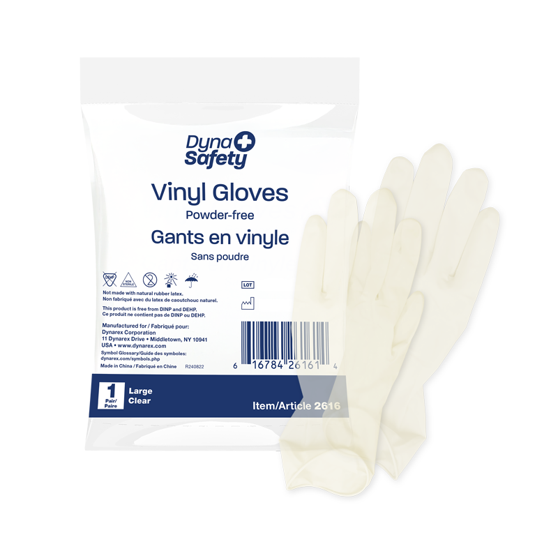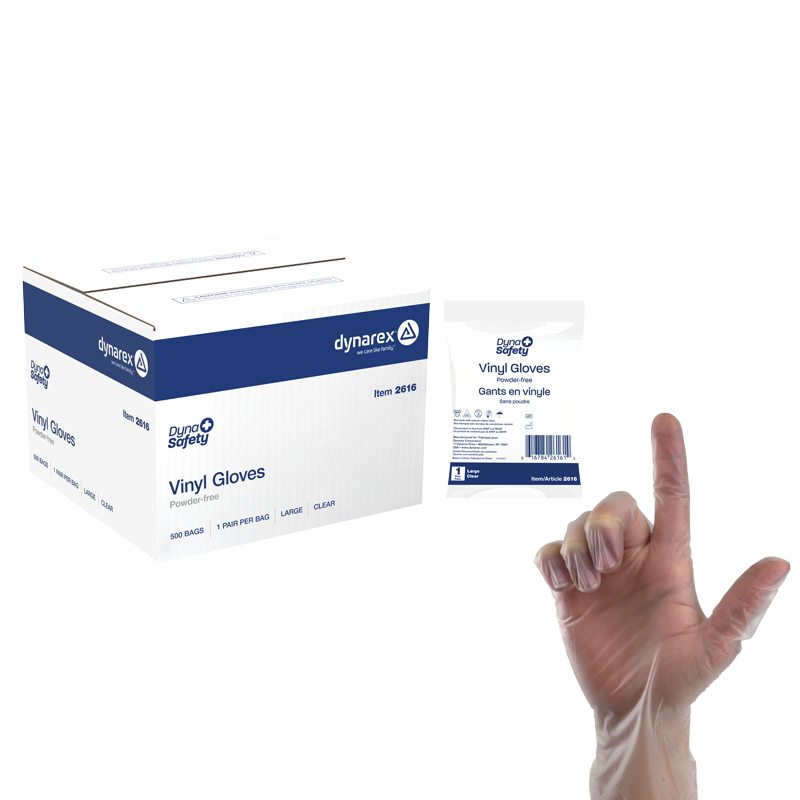 Dynarex DynaSafety Vinyl Gloves in a Bag are premium-quality, powder-free vinyl gloves designed for improved protection and flexibility. The Gloves are crafted from a soft vinyl resin for added elasticity and increased sensitivity. These ambidextrous Gloves feature a minimum thickness of 3 mils at the palm and 2 mils at the fingertips. Dynarex Vinyl Gloves in a Bag are designed with beaded cuffs to allow for easy donning. These Gloves have a secure fit around the wrist and hand-conforming flexibility to help prevent physical fatigue. Ideal for a variety of settings, including first-aid, medical facilities, long-term care, food service, and hair salons.