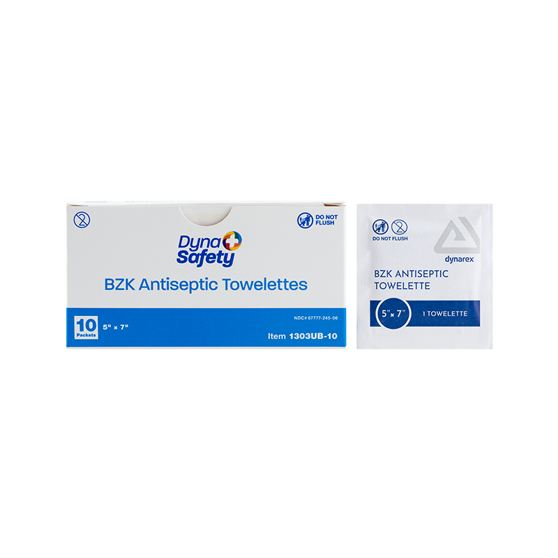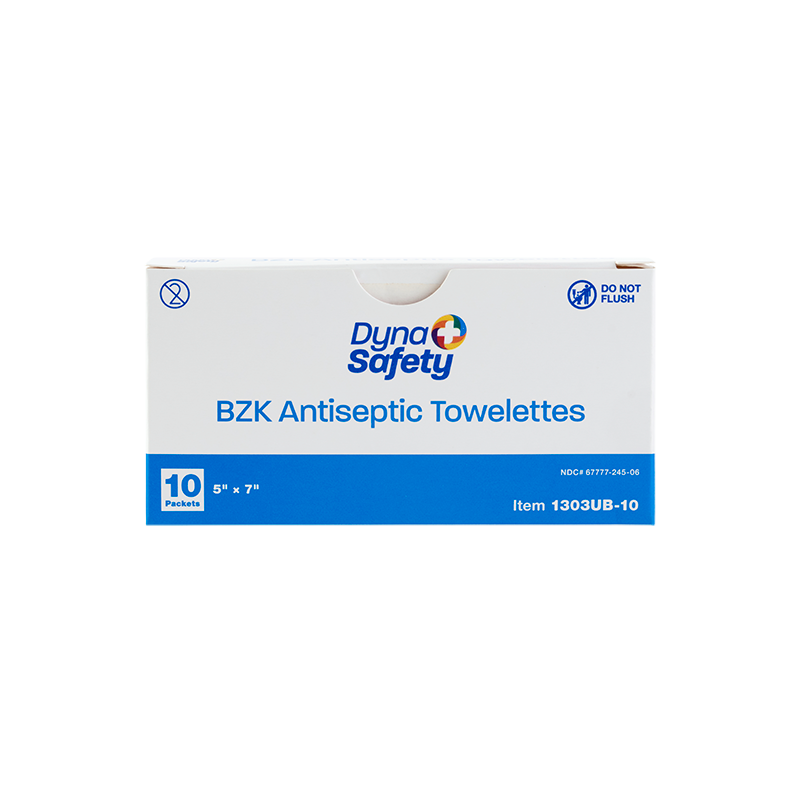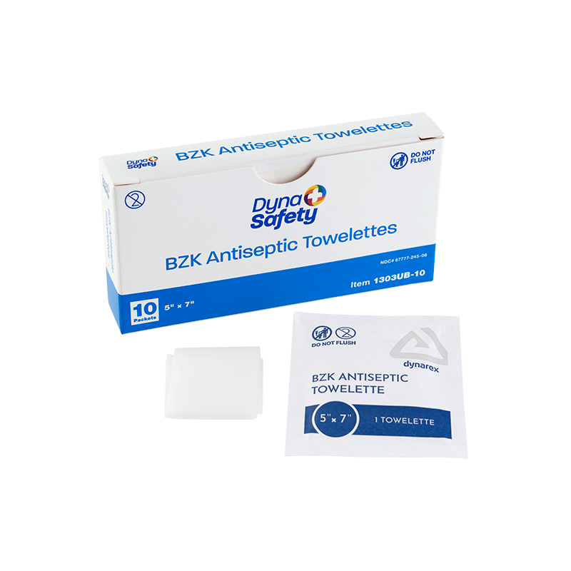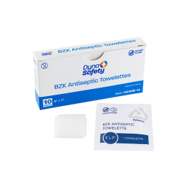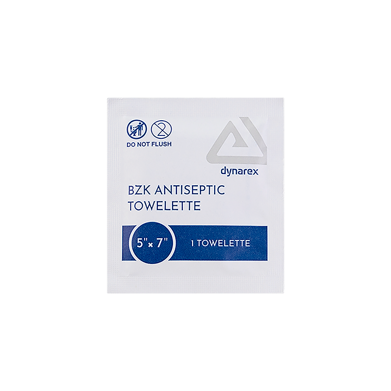 Dynarex DynaSafety BZK Antiseptic Towelettes are premoistened wipes formulated with benzalkonium chloride designed to help protect against germs and bacteria. These wipes are designed to cleanse skin and help prevent infection in minor cuts, scrapes, and burns without the need for soap and water. The Towelettes feature a non-irritating, alcohol-free, and fragrance-free formula for gentle daily use. The single-use, individually wrapped Towelettes are ideally sized for first-aid kids, medical settings, nursing stations, and a variety of other uses.