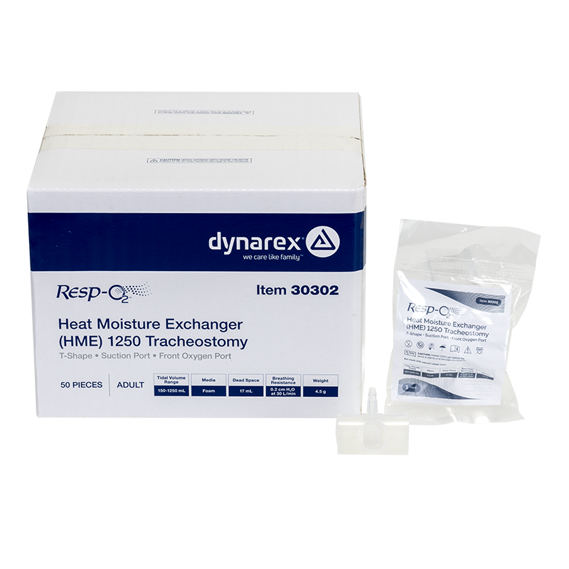 Dynarex Resp-O2 Trach HMEs are single-use, disposable respiratory devices designed to provide humidification for tracheostomy patients. Quantity per Case: 50