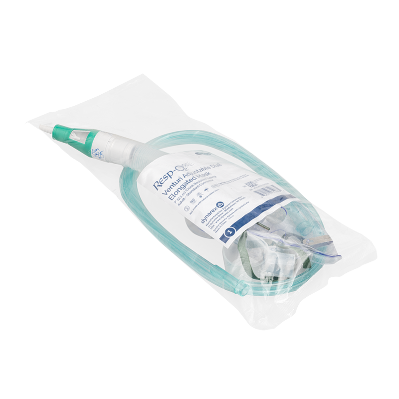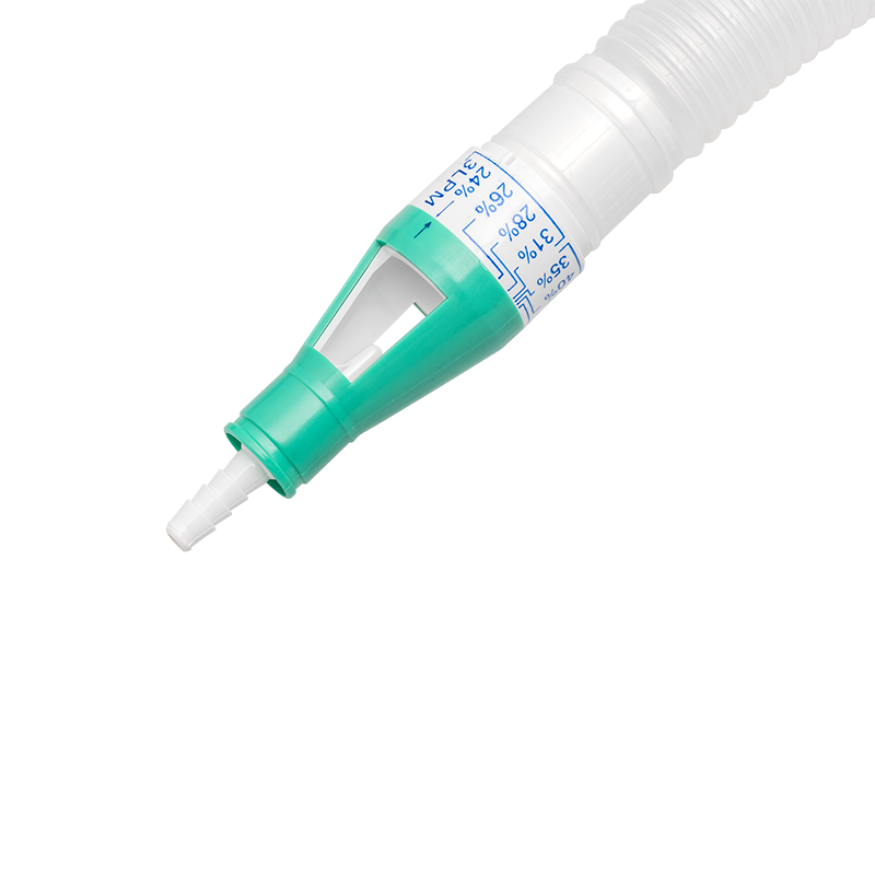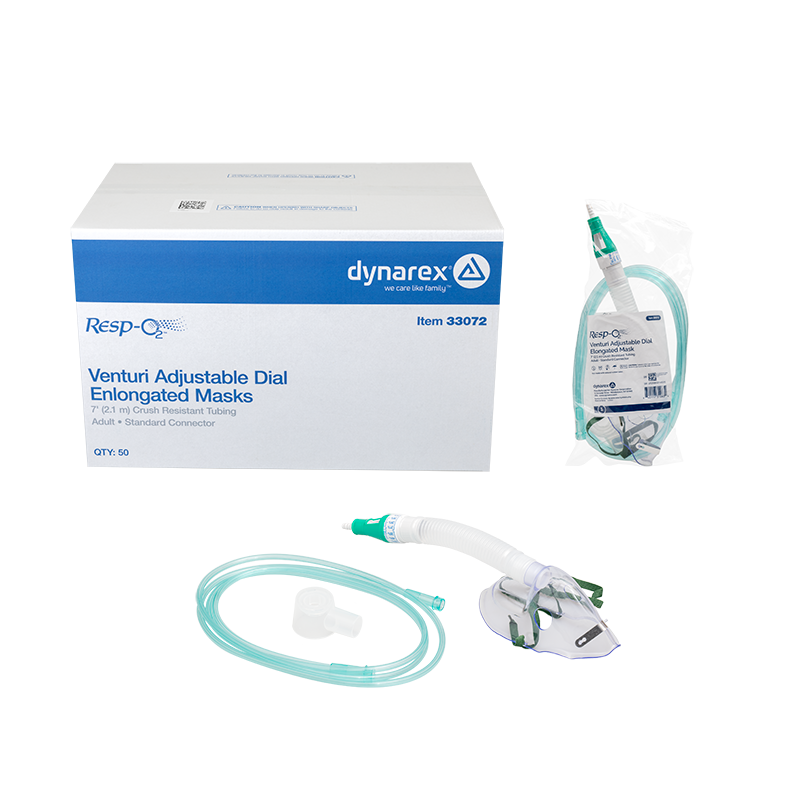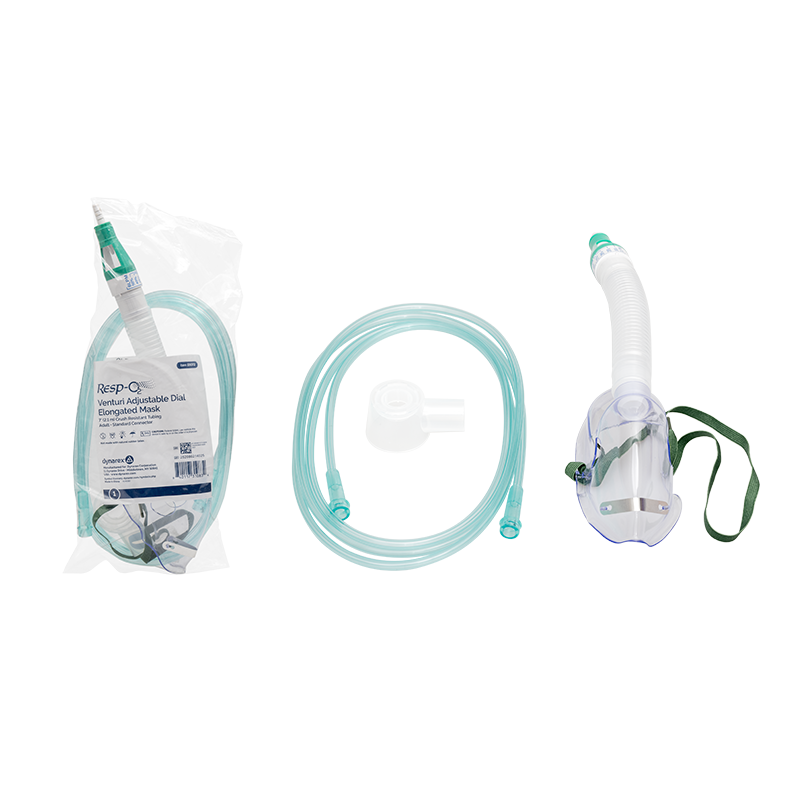 Resp-O2™ Venturi Masks provide an ideal system for delivering controlled concentrations of supplemental oxygen to suit a wide variety of patient needs. Each mask includes 7 feet of kink-resistant, star lumen tubing to allow oxygen to flow freely. The transparent vinyl masks feature smooth edges, adjustable nose clips, and elastic straps for easy adjustment and a secure, non-binding seal. Masks are equipped with either color-coded dilutor jets or an adjustable dial for precise oxygen regulation.
