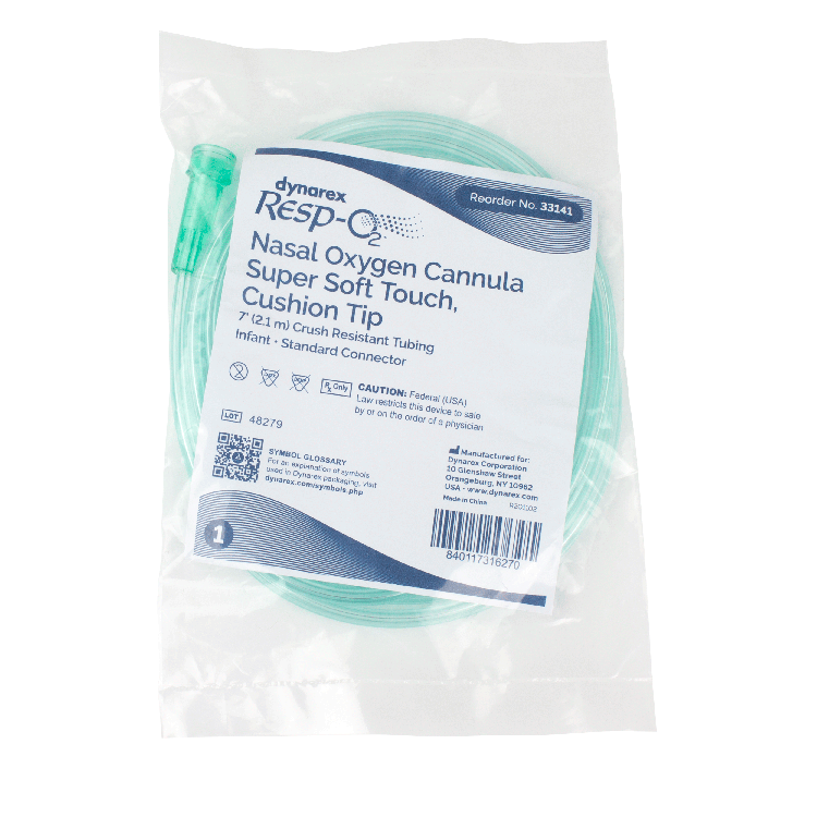 Dynarex Resp-O2 Nasal Oxygen Cannulas, Super Soft Touch with Cushion Tips are designed to efficiently deliver supplemental oxygen to respiratory patients. The cannulas come with either Standard or Universal connectors and feature light green oxygen supply tubing, designed to help improve tube visibility.