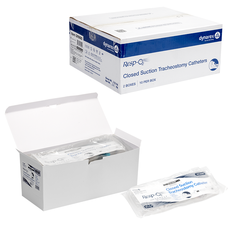 Dynarex Resp-O2 Closed Suction Trach Catheters are disposable respiratory devices designed to safely remove secretions from the respiratory tracts of ventilator-dependent patients. The device allows ventilation to continue during suctioning, helps prevent cross-contamination, and protects caregivers from airborne pathogens.