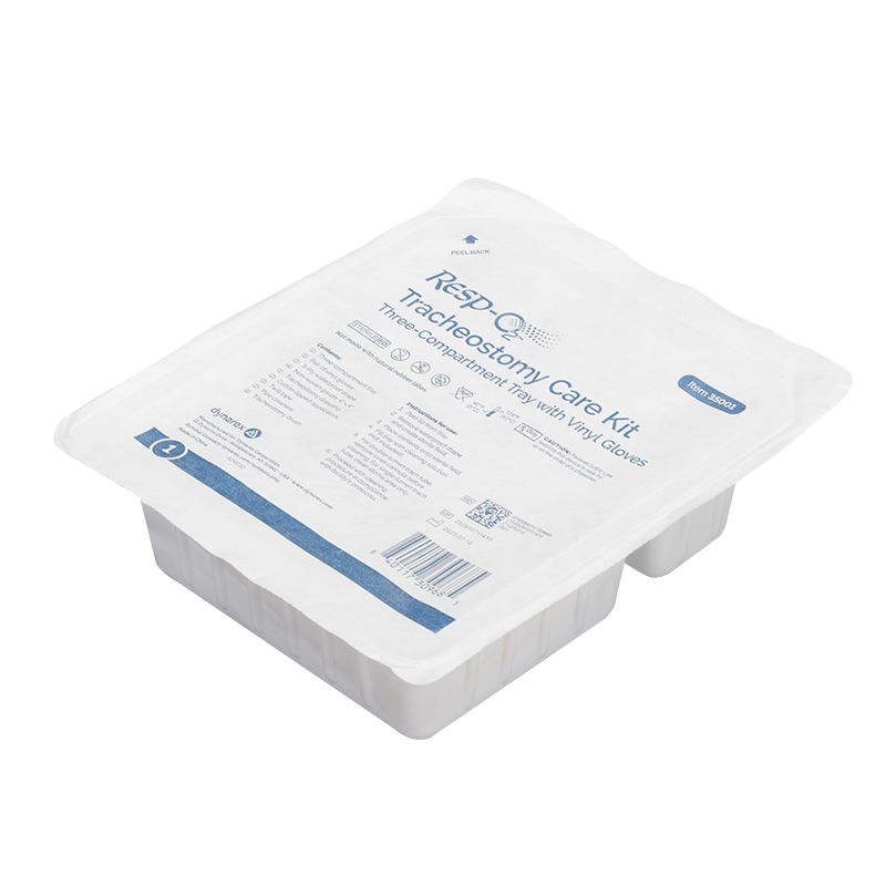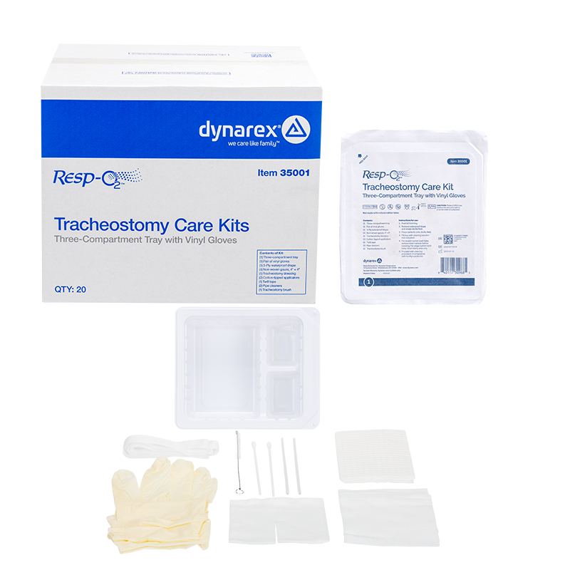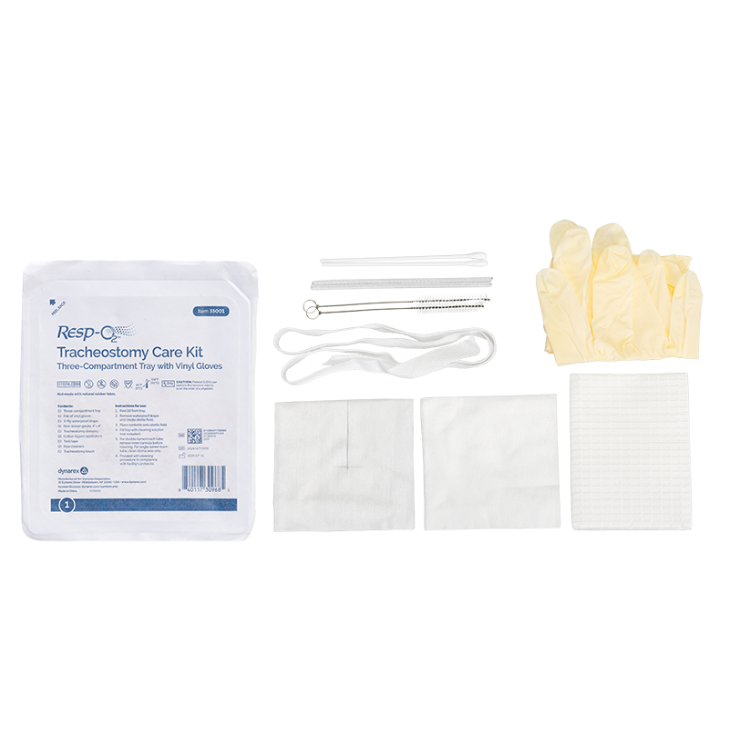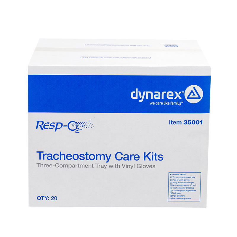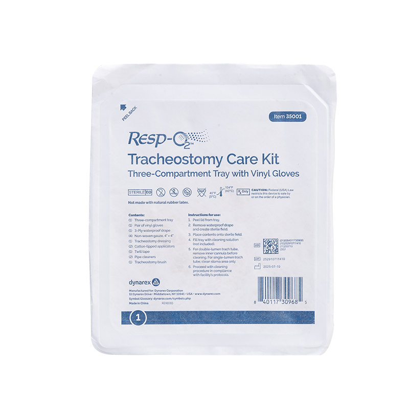 Dynarex Resp-O2 Tracheostomy Care Kits are designed to provide the essential components needed for the preparation, cleaning, and care of tracheostomy tubes. These time-saving kits are disposable, portable, and compact for easy use and storage. The components in these fully sealed, single-use kits are sterile and come packed in sequence of use for maximum efficiency.