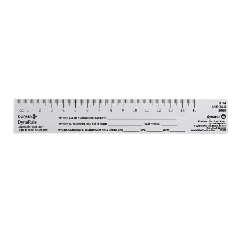 DynaRule Disposable Paper Rulers are designed to directly measure wounds in both centimeters and millimeters for accurate documentation. These single-use, disposable rulers help promote optimal hygiene for reduced risk of infection and contamination. The flexible paper conforms to body contours to allow for more precise measurement. These rulers are ideal for initial wound assessment as well as tracking progress over time. Compact and lightweight, they are easy to store and carry, making them ideal for hospitals, long-term care facilities, and emergency rooms.