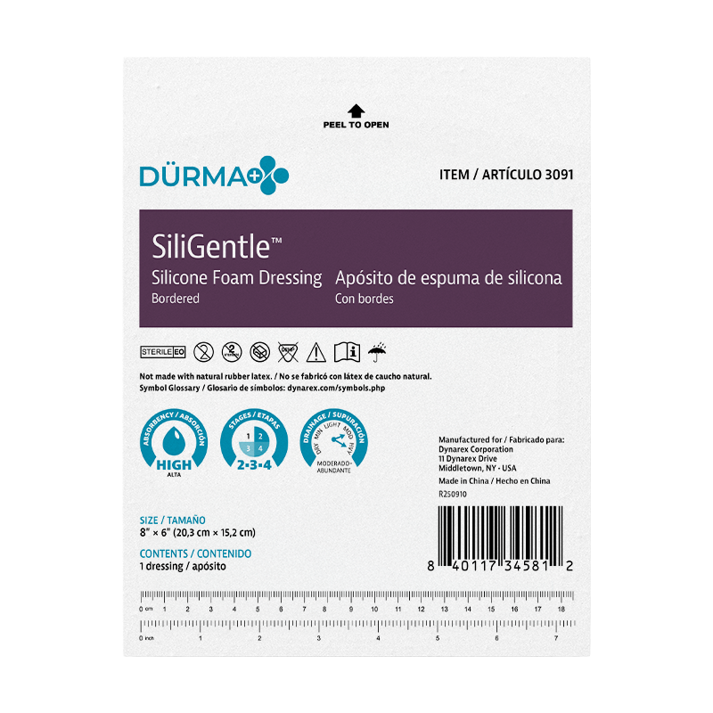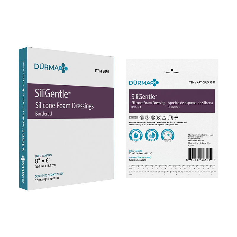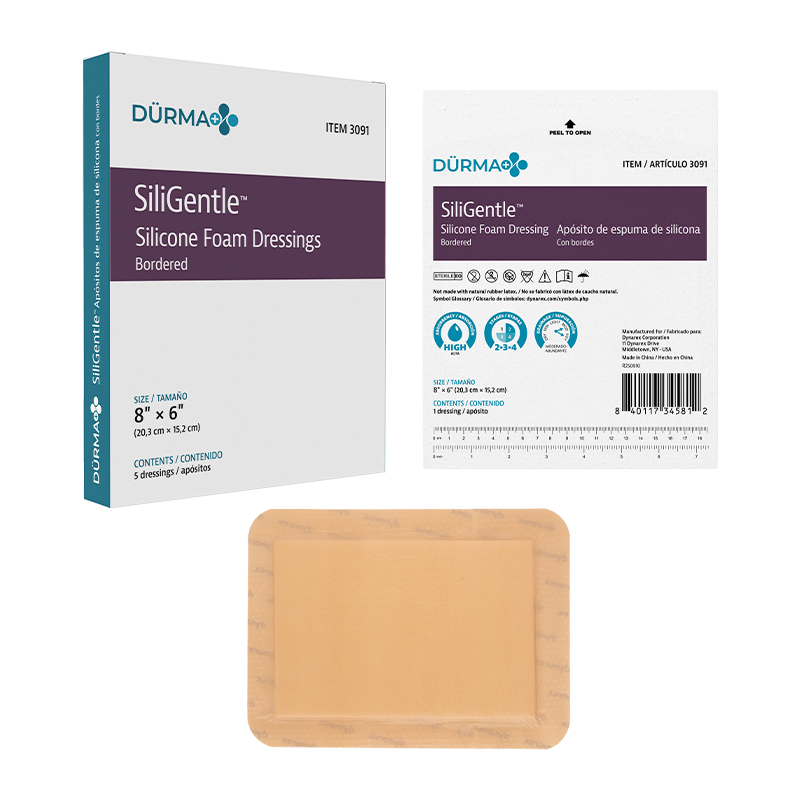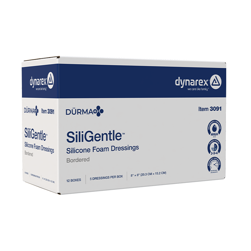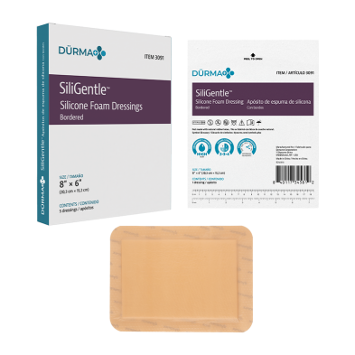 Dürma+ SiliGentle Silicone Foam Dressings are soft, highly absorbent dressings with a vapor-permeable waterproof film. Designed to lock away exudate and minimize pain and trauma, they are available in bordered and non-bordered varieties.