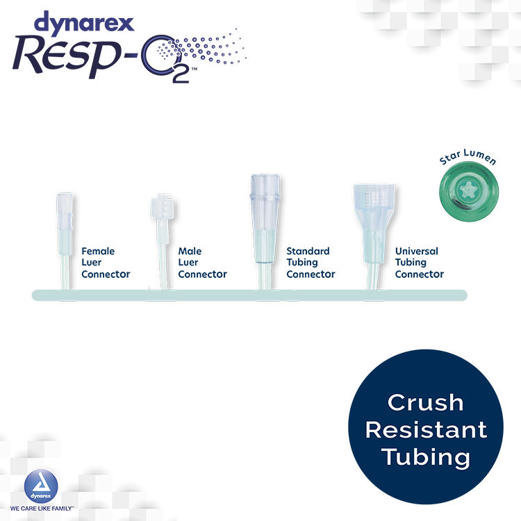 Dynarex Resp-O2 EtCO₂ Nasal Sampling Cannulas feature a permanent prong barrier for simultaneous EtCO₂ sampling and oxygen delivery, with soft, cushioned tips for added comfort.